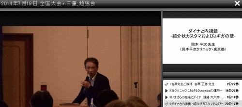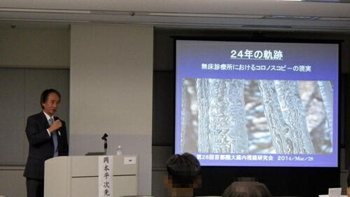 コロノスコピ−の「黎明期」と「超現実」と題し、前半は岡本平次クリニックの紹介、シンヤ式コロノスコピーのエピソード(ニューヨー