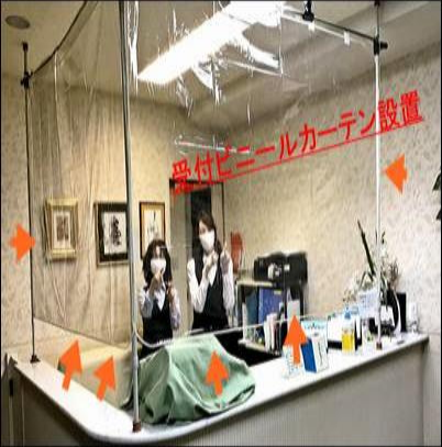 自作ビニールカーテン: 早く取り払えるよう願いつつ作成 受けつけスタッフ4名 |